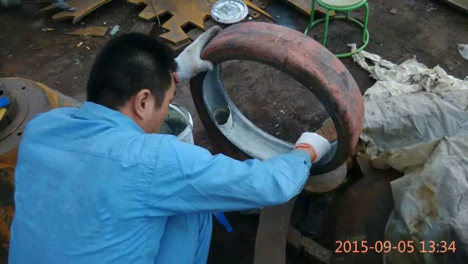 圖(2)北京耐默公司裴工正在采用KN17渣漿泵修復材料修復泵殼